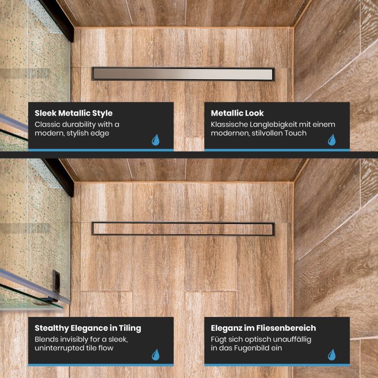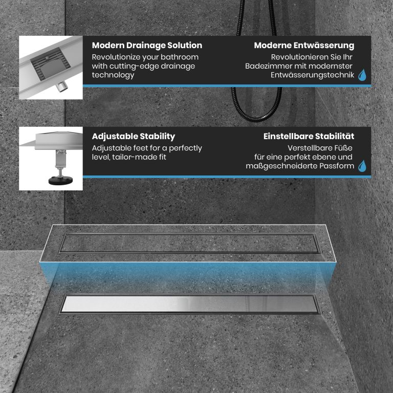 Proměňte svou koupelnu v oázu stylu a inovací díky našim vynikajícím lineárním sprchovým odtokům. Nerezová ocel nejvyšší kvality, umně kartáčovaná, v kombinaci s pískovaným hlavním tělem. Design vaší koupelny si zaslouží něco výjimečného, proto jsou naše sprchové odtoky navrženy tak, aby nejen zaujaly, ale také inspirovaly svou odolností. Díky zapuštěnému povrchovému materiálu vám zaručujeme výrobek, který obstojí ve zkoušce času. Instalace je rychlá, nekomplikovaná a bez nutnosti použití baterií. Mysleli jsme na vše, abyste se mohli bez obav soustředit na to podstatné. Vylepšete tvar a funkci svého sprchového koutu pomocí našeho elegantního a odolného lineárního sprchového odtoku, který dodá vaší každodenní rutině sofistikovanost.