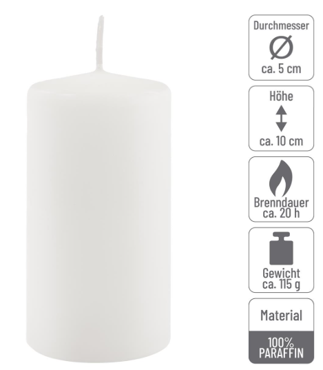 Každá svíčka je vyrobena ze 100 % parafínu, má průměr 5 cm, výšku 10 cm a poskytuje cca 20 hodin rovnoměrného hoření. Neparfémované a opakovaně zapálitelné, jsou vhodné pro použití v žáruvzdorných svícnech a lze je bezpečně kombinovat při různých příležitostech.