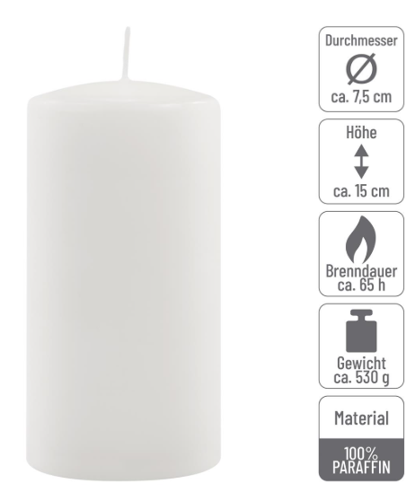Každá svíčka má průměr 7,5 cm a výšku 15 cm, je vyrobena ze 100 % parafínu a nabízí cca 65 hodin rovnoměrného hoření. Svíčky jsou neparfémované, stabilní a vhodné pro použití v různých svícnech či stolních dekoracích. Ideální pro opakované zapalování i dlouhodobé použití.