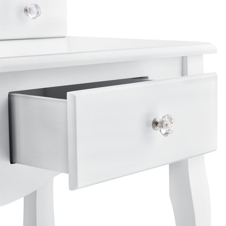 Stolek je vyroben z pevného MDF materiálu s bílým lakem, který chrání povrch před poškrábáním. Čtyři zásuvky umožní přehledné uložení všech kosmetických potřeb. Montáž je snadná a rychlá, údržba nenáročná.