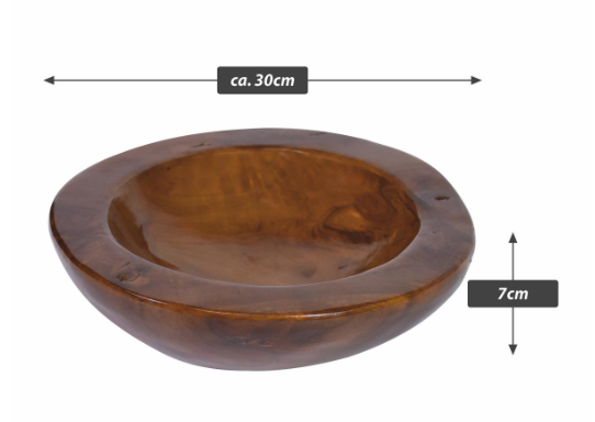 Mísa je vyrobena z masivního teakového dřeva s průměrem přibližně 30 cm, proto se může tvar i řezba mírně lišit. Povrch není určen pro venkovní použití, čímž se zachovává přirozená krása dřeva. Pevná konstrukce a tvrdost teaku zaručí dlouhou životnost a snadnou údržbu, což ocení každý, kdo si potrpí na kvalitní materiály.