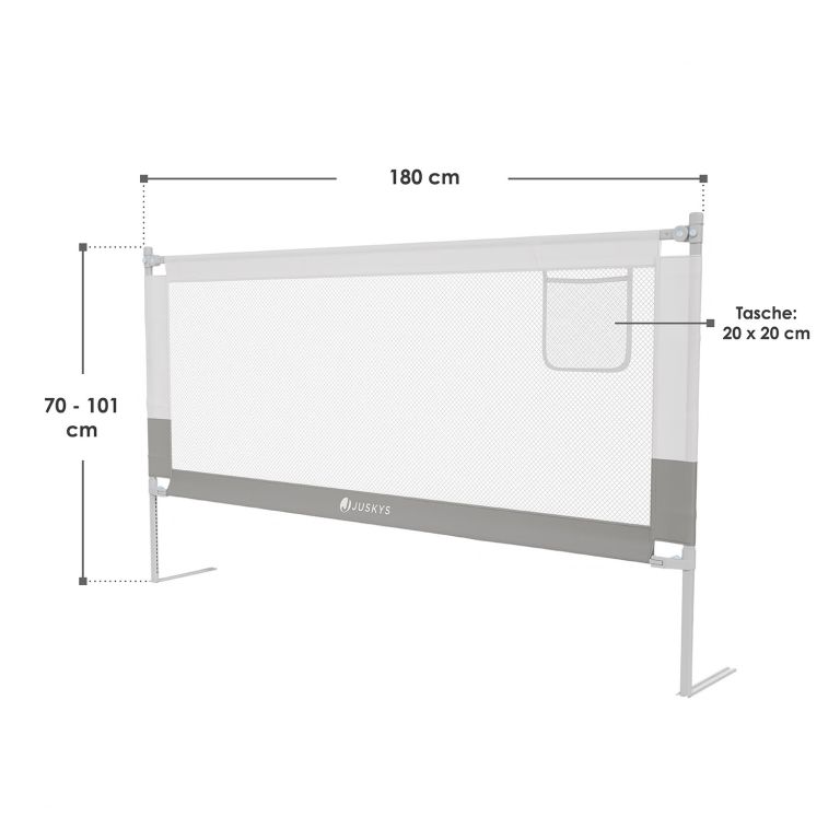 Klidný spánek dítěte je pro rodiče k nezaplacení. Postelová zábrana Jaron o délce 180 cm poskytne vašemu malému spáči spolehlivou ochranu před pádem z postele. Díky nenápadnému designu v šedé barvě působí elegantně a zapadne do každého dětského pokoje i ložnice. Praktická kapsa na boku se postará o to, aby byla lahev nebo dudlík vždy po ruce.