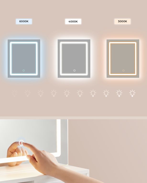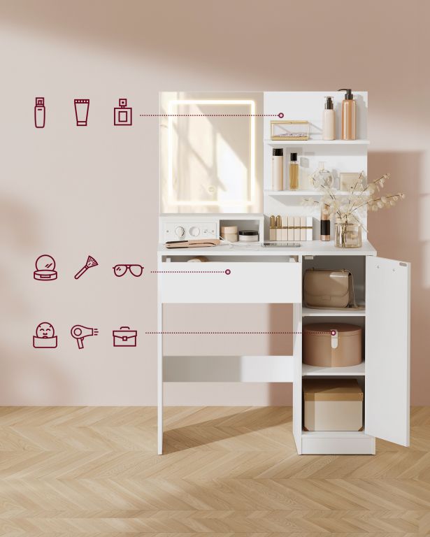 Objevte dokonalou harmonii stylu a funkčnosti s tímto kosmetickým stolkem. Jeho čisté linie a bílý povrch rozzáří každý prostor a nabídnou místo pro všechny vaše oblíbené kosmetické produkty. LED zrcadlo s nastavitelným osvětlením dodá každému líčení ten správný šmrnc.