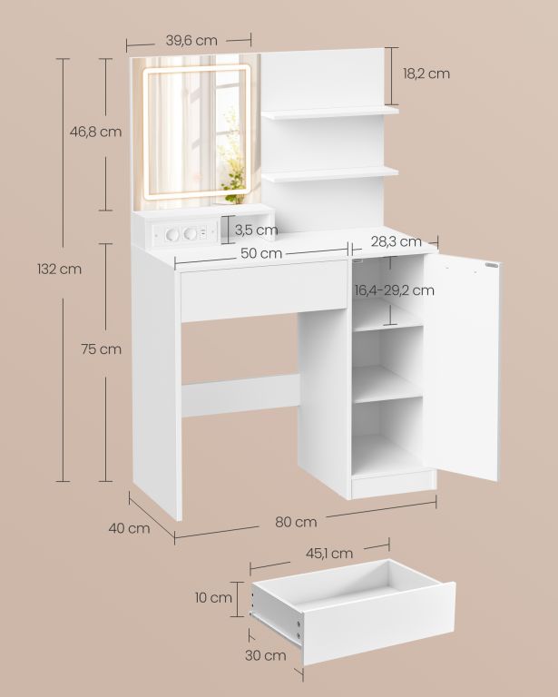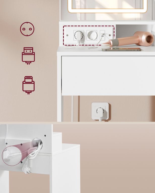Stolek je vyroben z odolné MDF a dřevotřísky, což zaručuje stabilitu a snadnou údržbu. Praktické zásuvky, police a skříňka umožní přehledné uspořádání kosmetiky, zatímco napájecí panel s USB a zásuvkami usnadní každodenní používání elektroniky. Ochrana proti převrácení zajistí bezpečnost i v rodinách s dětmi.