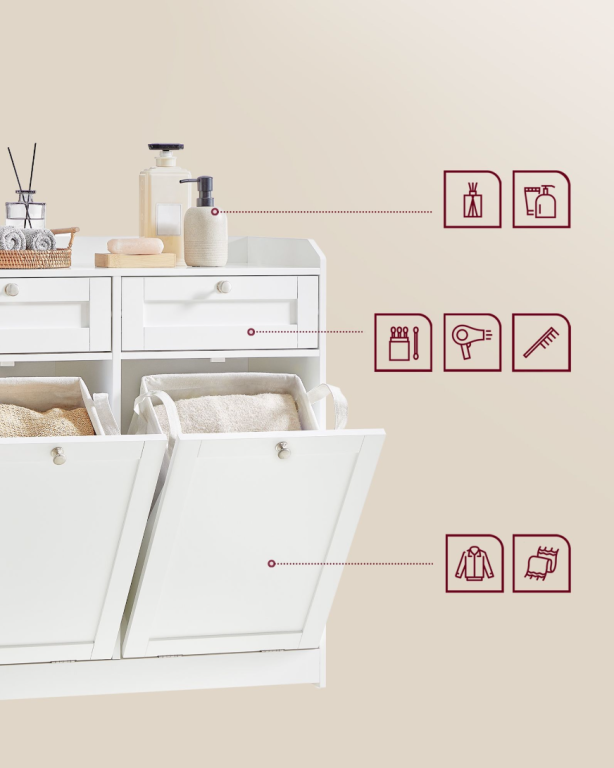 Elegantní koupelnová skříň s dvěma výklopnými koši na prádlo a dvěma zásuvkami v nadčasové barvě Cloud White přináší do vašeho domova praktické a stylové řešení úložného prostoru. V horní části skříně je dostatek místa pro kosmetiku, ručníky či dekorace, zatímco výklopné koše umožňují pohodlné třídění prádla. Díky kombinaci dřeva a textilu působí skříň moderně a útulně.