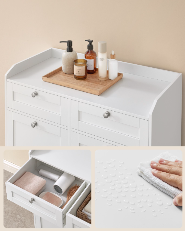 Konstrukce z MDF desek, zesílené kovovými panty, zajišťuje stabilitu a dlouhou životnost. Voděodolné povrchy i vnitřní úprava košů umožňují snadné čištění. Skříň je ideální volbou pro každého, kdo hledá funkční nábytek s důrazem na detail a kvalitu. Muž ocení pevné provedení, promyšlené rozměry a chytré řešení úložného prostoru, které usnadní každodenní rutinu.