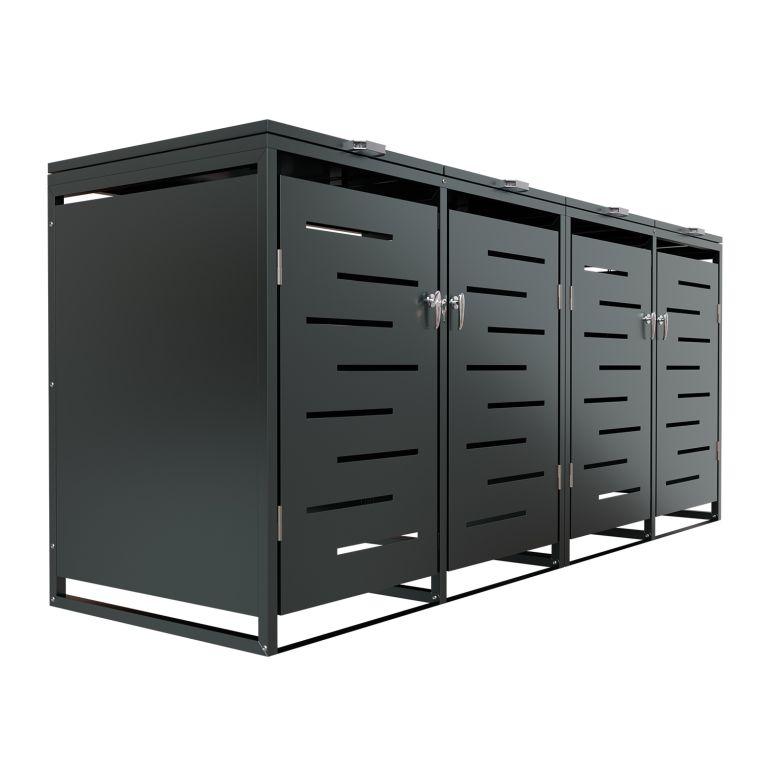 Robustní tělo z pozinkované oceli si poradí s deštěm, sněhem i sluncem, a navíc se velmi snadno udržuje. Horní víka s plynovými vzpěrami umožní pohodlné otevírání shora, zatímco přední dvířka s klíčkem zajistí snadný přístup a bezpečnost. Tento čtyřmodulový přístřešek je ideální pro rodiny i vícegenerační domy a v případě potřeby lze systém dále rozšiřovat.