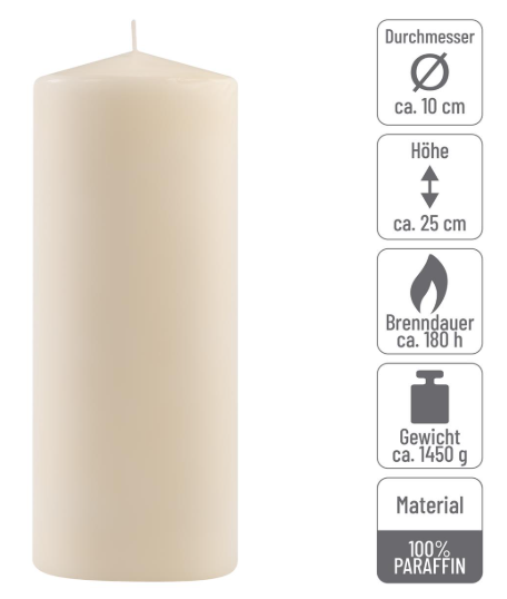 Set obsahuje dvě robustní parafínové svíčky o rozměrech 25 cm výšky a 10 cm průměru, každá poskytuje zhruba 180 hodin hoření. Neparfémované, bez citronelly či jiných přísad — bezpečné, bez zbytečných vůní. Ideální jako dlouhodobá dekorace či praktické osvětlení i pro náročné použití.