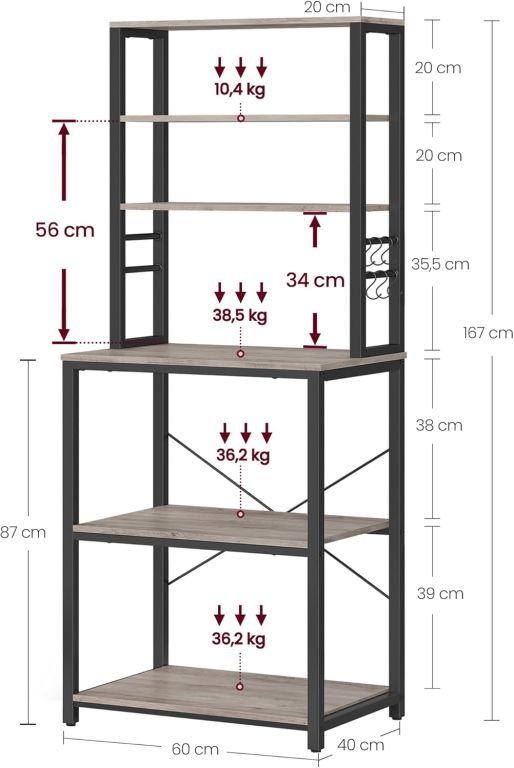 Vneste do svého domova přehlednost a styl. Tento praktický kuchyňský regál s rustikálním dřevěným dekorem a černou ocelovou konstrukcí dodá interiéru osobitý industriální nádech. Šest polic a šest háčků nabízí dostatek prostoru pro mikrovlnku, kávovar i kuchyňské potřeby. Díky univerzálnímu designu se hodí nejen do kuchyně, ale i do jídelny, pracovny či obývacího prostoru.