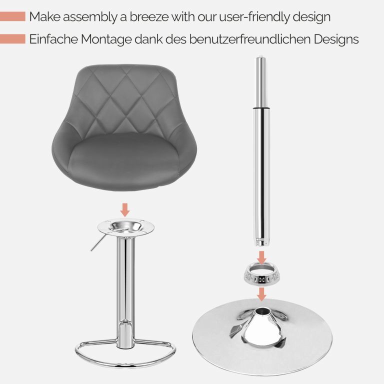 Proměňte svůj prostor pomocí těchto elegantních barových stoliček, které se skvěle hodí do kuchyně, baru nebo kanceláře. Díky výškově nastavitelnému mechanismu jsou flexibilní pro všechny výšky pultu, zatímco chromovaný ocelový rám a zaoblená 38,5 cm vysoká základna zajišťují robustnost a stabilitu. Sedáky jsou čalouněné snadno udržovatelnou imitací kůže a nabízejí maximální pohodlí díky velkorysému pěnovému polstrování o tloušťce 5 cm. Díky působivé nosnosti 120 kg jsou tyto stoličky vhodné pro širokou škálu uživatelů. Každá sada se skládá ze dvou barových stoliček s otočným sedákem o 360°, integrovanou opěrkou nohou, nastavitelnou plynovou pružinou a robustní deskou pro podepření základny.