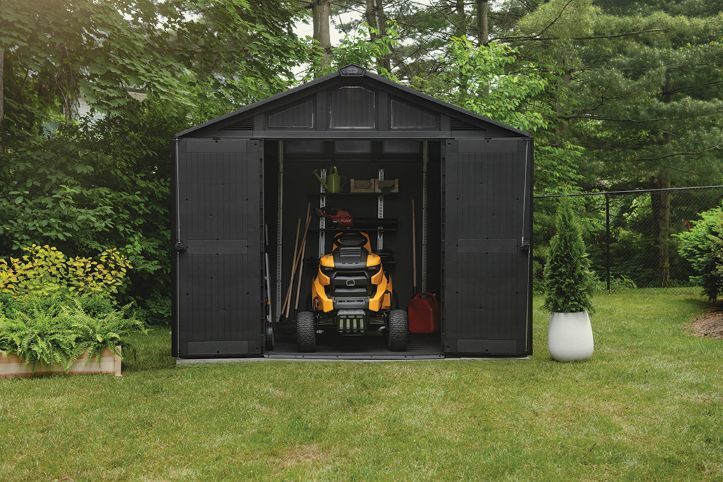 Se širokými dvojitými dveřmi můžete do domku uskladnit jízdní kola, sekačku na trávu, nářadí, truhlářskou dílu či spoustu dalších zahradních doplňků.