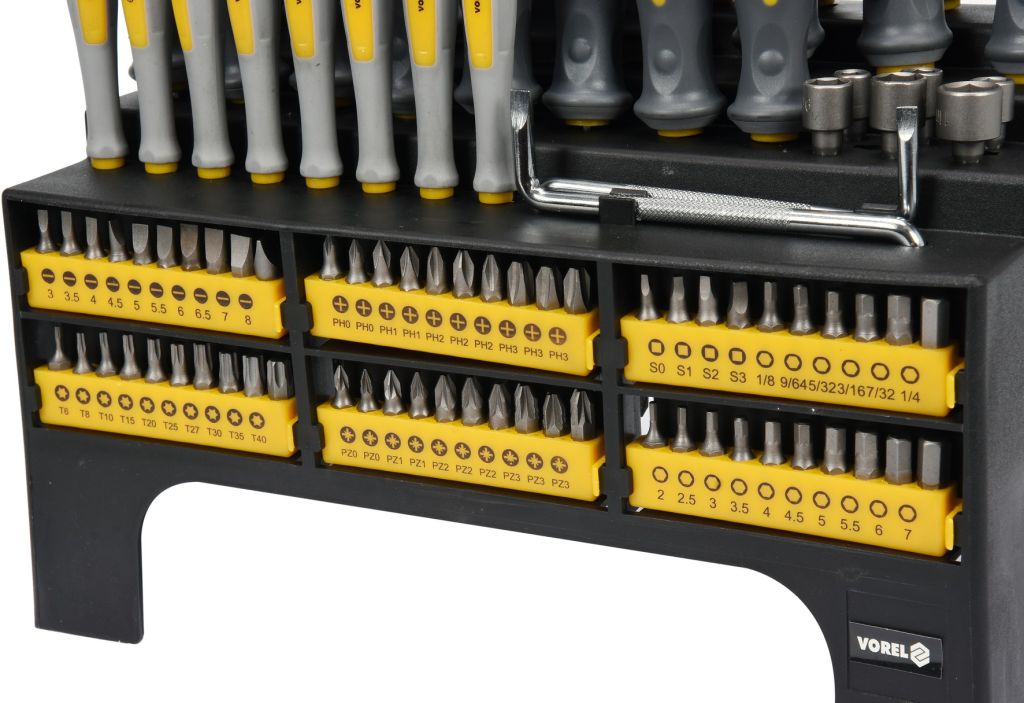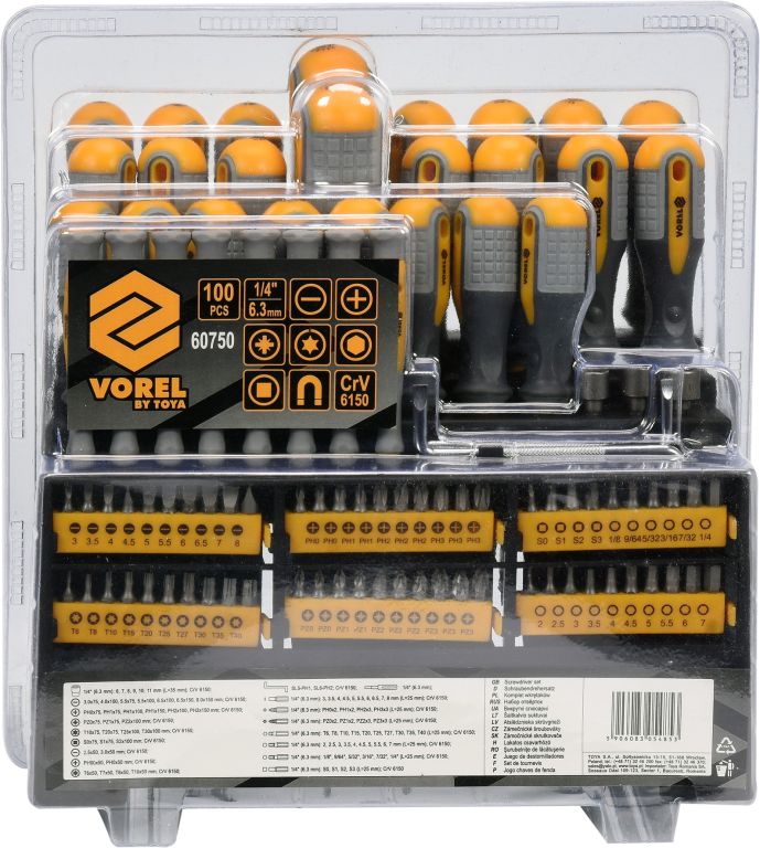 Sada šroubováků Vorel 60750. Vyrobeno z vysoce kvalitních materiálů. Široká škála velikostí zajišťuje všestranné použití a schopnost dosáhnout těžko dostupných míst. Odolná CrV 6150 ocel, Ergonomické, protiskluzové PP a TPR rukojeti.