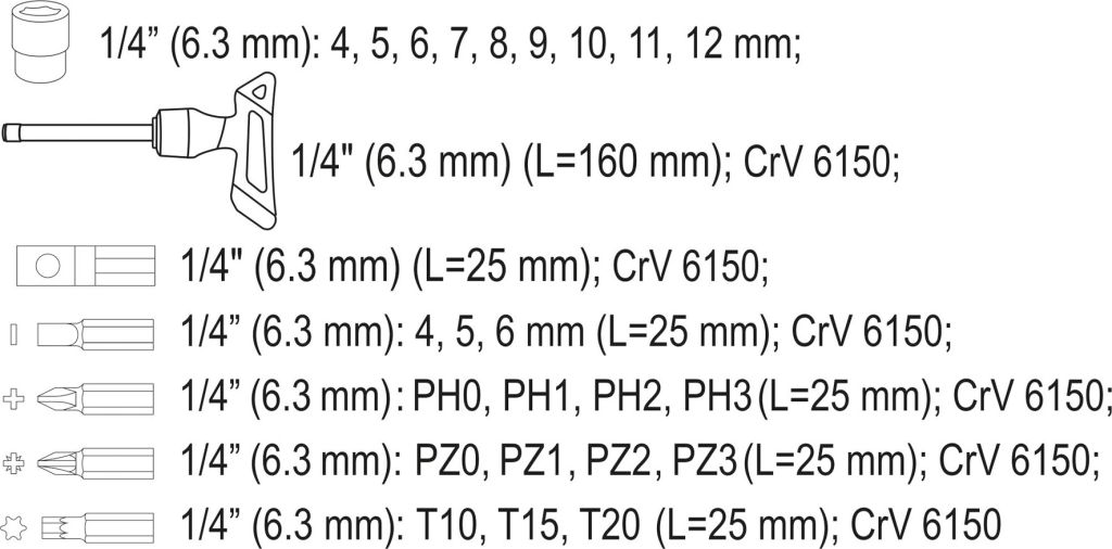 • nástavec: 1/4": 4; 5; 6; 7; 8; 9; 10; 11; 12 mm