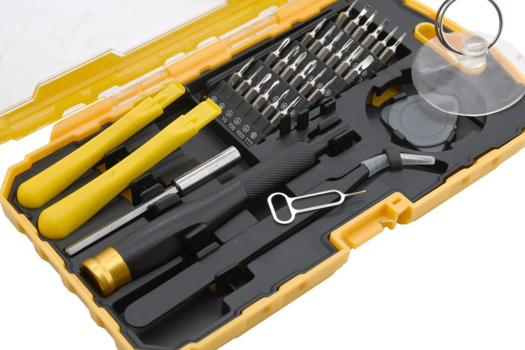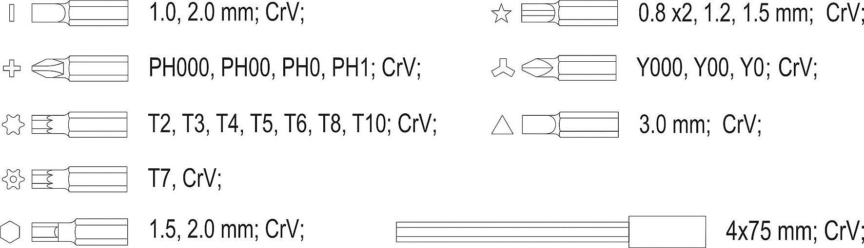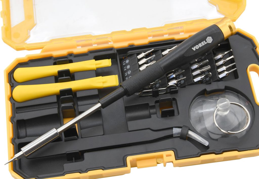 Praktická sada šroubováku s bity a dalšími nástroji pro opravy mobilních telefonů, navigací a další drobné elektroniky. Nářadí je precizně zpracováno z CrV oceli a jednotlivé nástavce 5/32"(4 mm) jsou magnetické, čímž usnadňují práci se součástkami. Sada dále obsahuje nástroje v podobě plastových páčidel, přísavku, precizní zahnutou pinzetu a nástroj pro extrakci Sim karet. Sada je uložena v praktickém pouzdře z odolného plastu.