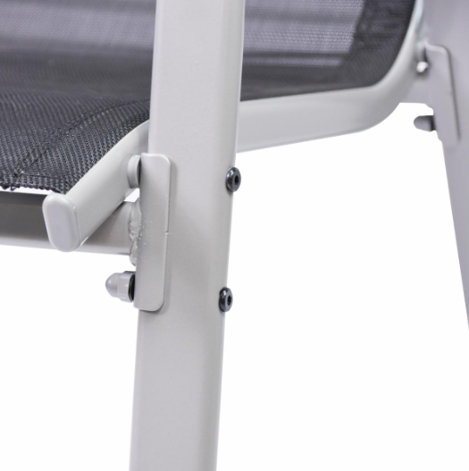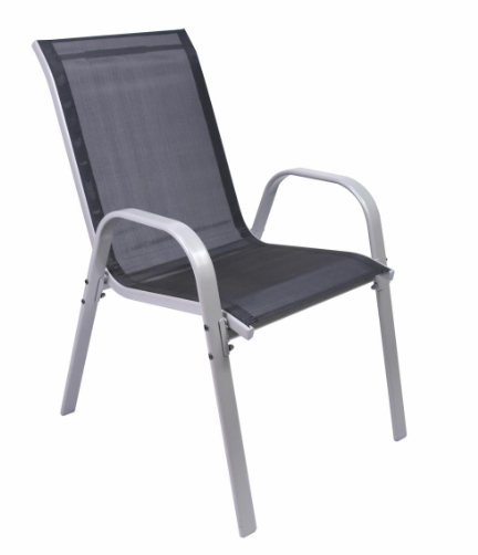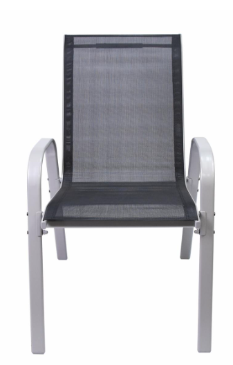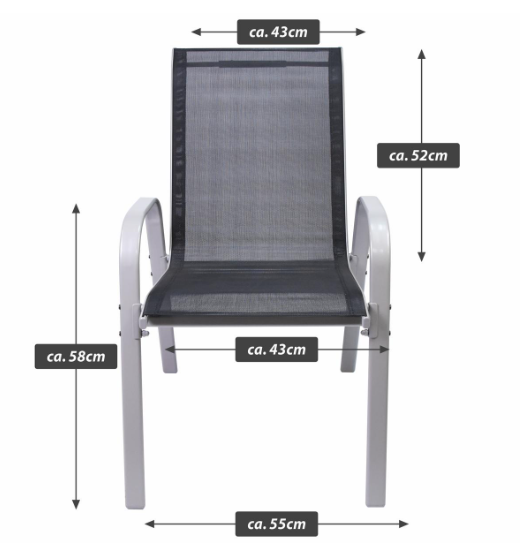 Tyto robustní židle kombinují stohovatelný ocelový rám s černým textilenovým výpletem – materiály odolné proti povětrnostním vlivům a nenáročné na údržbu. S rozměry 90 × 55 × 65 cm a sedací výškou 42 cm poskytují pevné a pohodlné sezení. Skvěle se stohují a šetří místo, ideální pro praktické využití v zahradě i domácí provoz.