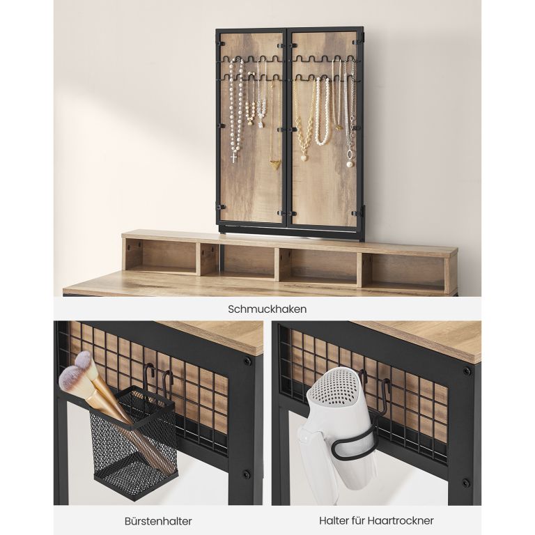 Stolek je vyroben z kvalitní dřevotřísky a pevné oceli, což zajišťuje dlouhou životnost a stabilitu. Trojité zrcadlo umožňuje pohled z různých úhlů, zatímco háčky a držáky usnadní uložení fénu, kartáčů i šperků. Montáž je snadná, údržba nenáročná a nosnost stoličky až 150 kg zaručuje pohodlí i bezpečí.