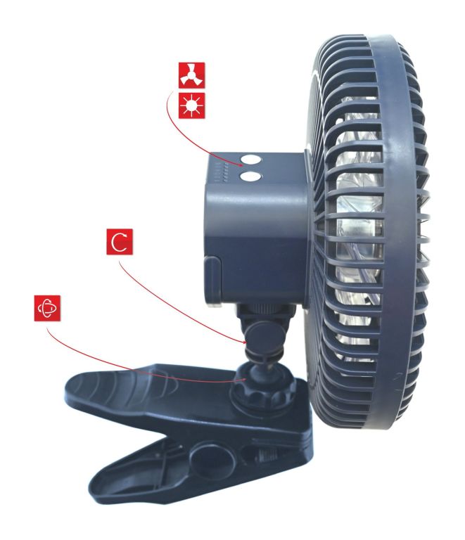 Tělo ventilátoru lze ve spodní části opatřit přiloženým kulovým kloubem, pomocí kterého lze ventilátor natočit do libovolného směru a pomocí jištěného mechanismu lze nastavit i sklon. Silný klips potom zajišťuje pevné a bezpečné uchycení na různém povrchu. Zadní část ventilátoru je navíc opatřena vyklápěcím držákem, díky kterému je možné zavěšení ventilátoru například na háček.